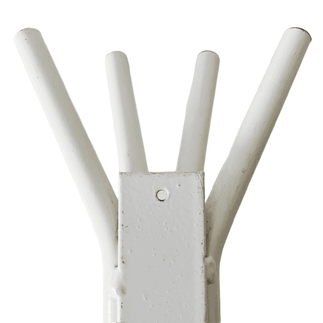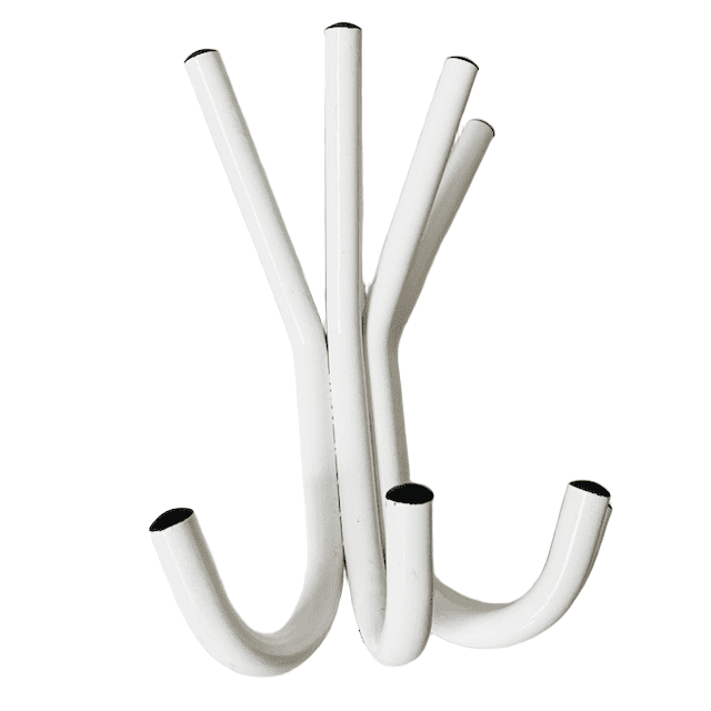 Deze kapstok is gemaakt van wit gelakt staal en kunststof zwarte noppen.
