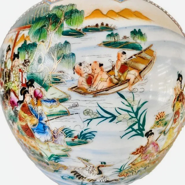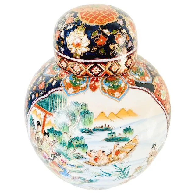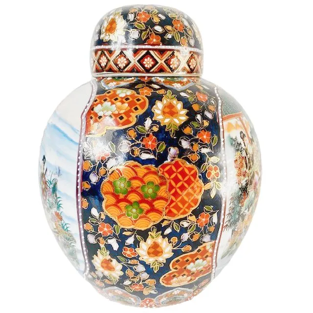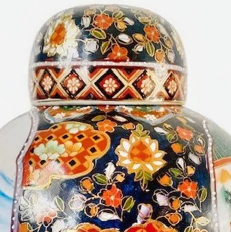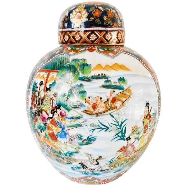 Schitterende vintage XL Chinese gemberpot met prachtige beschildering in o.a. donkerblauw en gouden details. Aan beide zijden is een leuk tafereeltje met geisha’s en kindjes te zien. De gemberpot is puntgaaf engemerkt aan de onderzijde. De vintage gemberpot is 21 cm hoog en heeft een doorsnede van 27 cm.