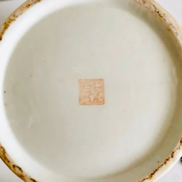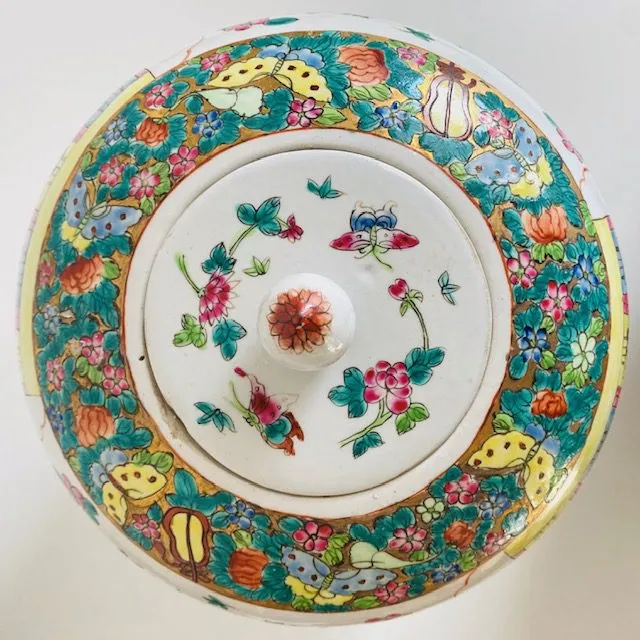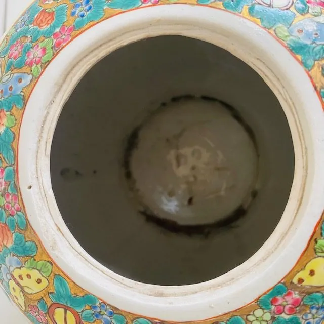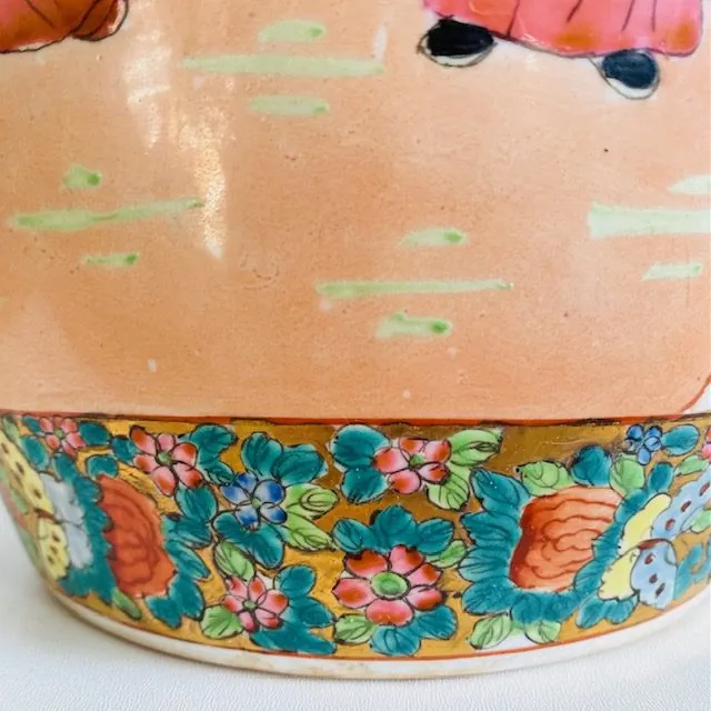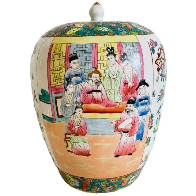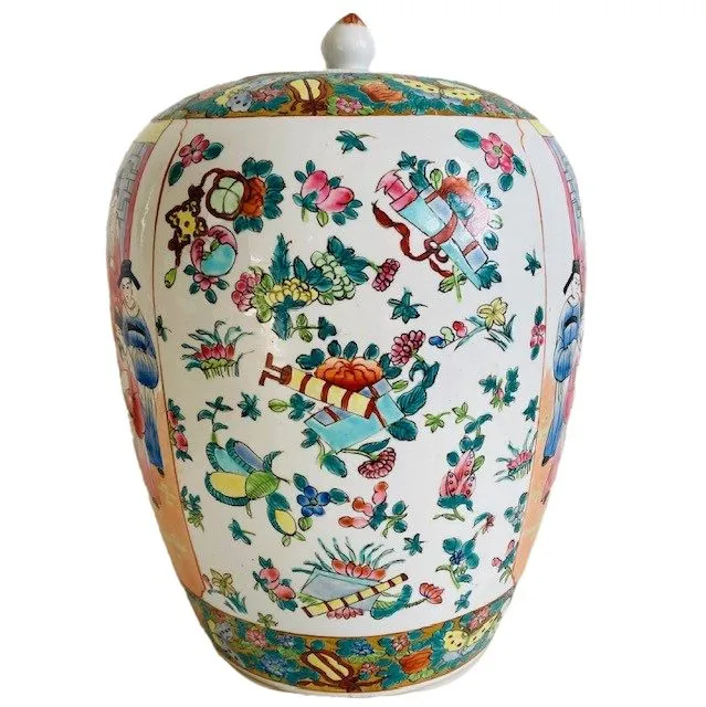 Deze vintage XL Chinese handgeschilderde gemberpot noemt men ook wel een canton rose medaillon pot. De vintage gemberpot is prachtig handgeschilderd met figuren, tafereeltjes en bloemmotieven. De gemberpot is gemaakt in China en dateert uit de 20e eeuw (jaren 60).