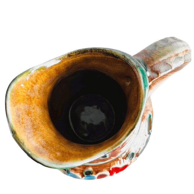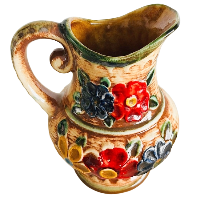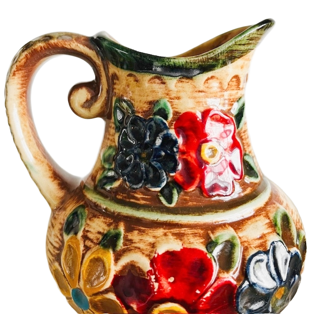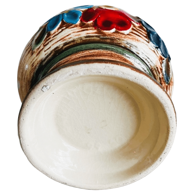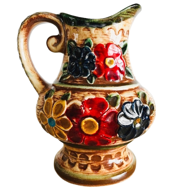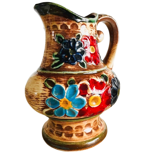 Een karakteristieke, vrolijke vaas uit de jaren 60 die eruitziet als een mand met bloemen, een beetje zoals de kleding die men toen droeg, met een bohemian tintje, zoals fantasievolle geborduurde bloemen en natuurlijke kleuren. Het was de tijd van de flowerpower!