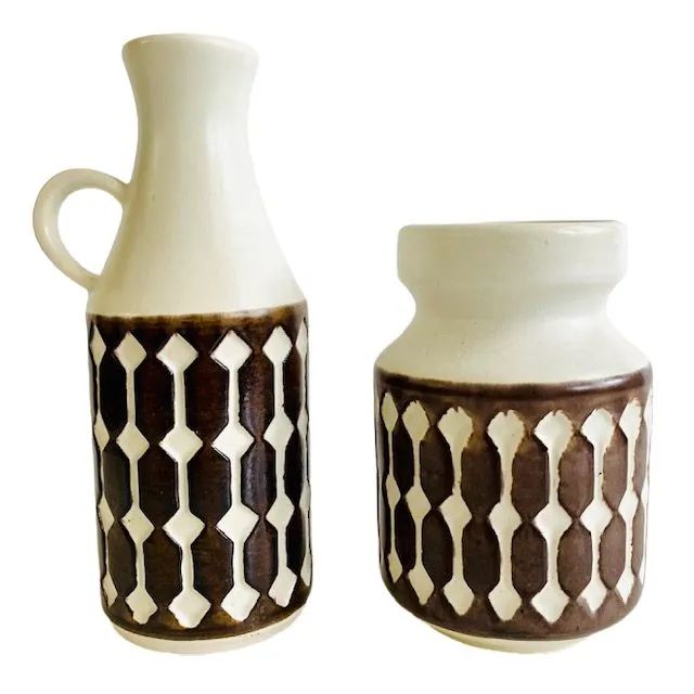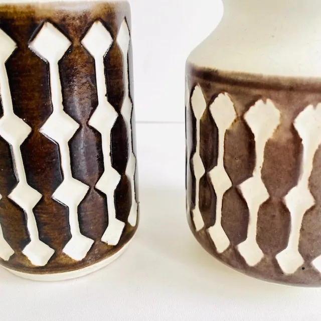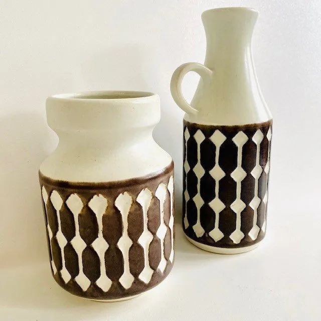 Supermooie, zeldzame hengselvaas en vaasje van Jasba uit de jaren 60 met reliëf decoratie. De set is crème wit met een mat bruin