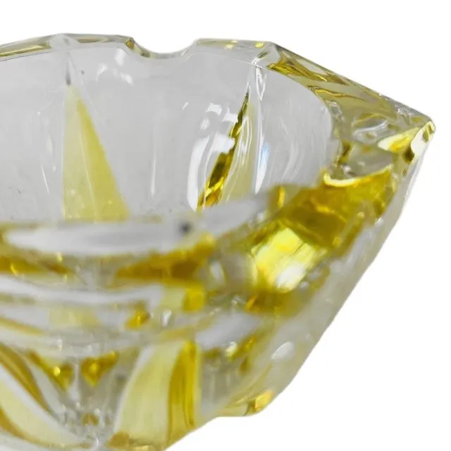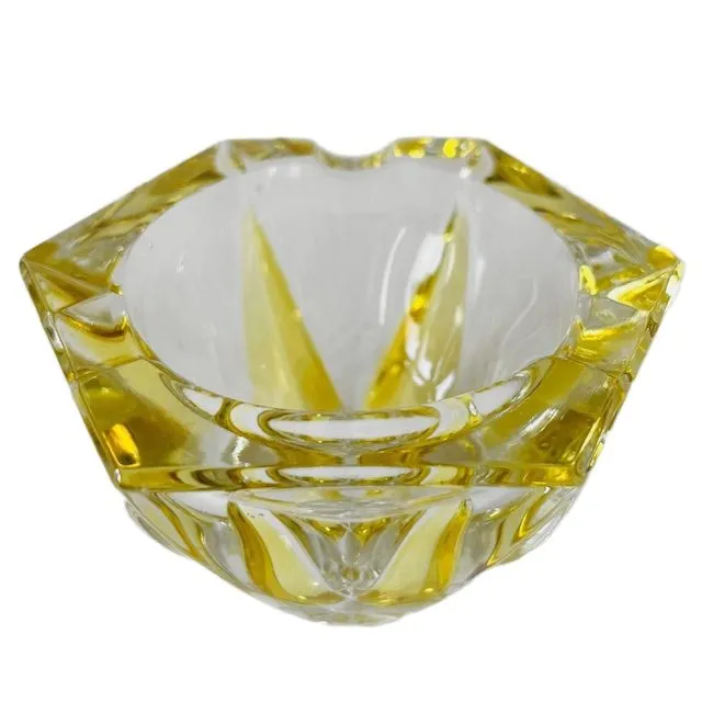 Deze zeshoekige asbak met stervormige decoratie en gebeeldhouwde vorm is gemaakt van dik, kleurloos en geel kristalglas.